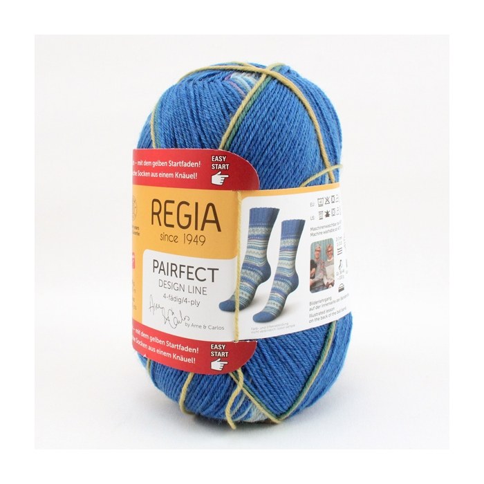 Made for Arne & Carlos by Regia of Germany. This skein is designed to make one pair of identical matching socks. The variegation makes an automatic pattern like the one pictured! Bright yellow yarn indicates where to begin knitting each sock.